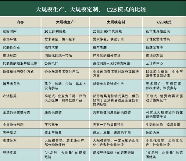 与工业时代“大生产+大零售+大品牌+大物流”的一整套体系相对应,基于个性化营销、巨型网络零售平台、柔性化生产以及社会化供应链的高速发展,C2B模式有了越来越坚实的支撑,其形貌、特征、机制也越来越成熟了。
