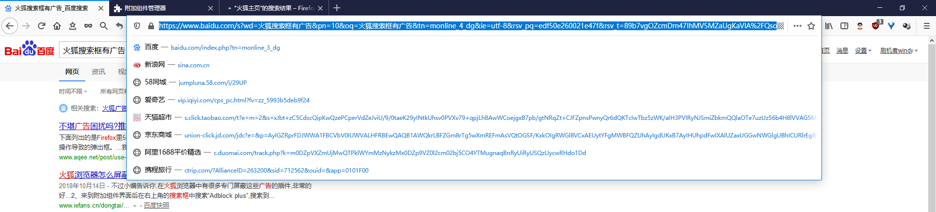 如何去掉火狐浏览器搜索框中的广告链接,百度、新浪网、58同城、爱奇艺、天猫超市、京东商城、阿里、携程旅游,我相信很多小伙伴更新了火狐最新版的时候发现了这些链接,网上我也找了好多攻略还是没有去掉,今天我就来分析一个我自己摸索出来的方法。